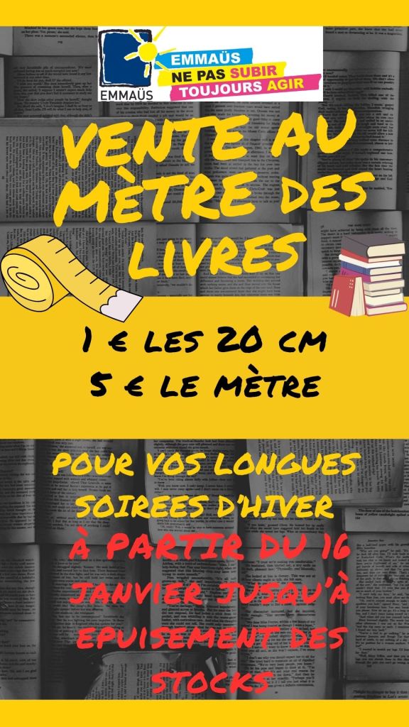Pour être à la page, de la lecture au mètre à EMMAÜS ALENÇON : une bonne occasion de s’y mettre (ou plus !). Et bien sûr si vos achats prenaient un caractère volumineux, il se pourrait qu’on vous livre…![]()
